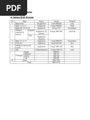Manakala di bawah penanaman secara. Akhir sekali, selepas menabur baja . Pembajaan yang disyorkan adalah seperti berikut : . No baja kadar harga tempoh. Jadual pembajaan durian bermula 1 hingga 4 tahun jenis baja yang disyorkan. Apabila daun telah flush selepas pembajaan pertama. 25kg baja pokok durian untuk subur akar dan banyakkan buah. Request permintaan dari tuan puan yang inginkan jadual pembajaan dari tumbesaran pokok fasa vegetatif hingga generatif. • kadar pembajaan untuk durian. Pokok durian boleh mencapai ketinggian sehingga 40 m. Jika tanah terlalu lembap, puradan perlu ditabur untuk membunuh hama atau serangga yang boleh menyerang akar pokok durian. Jarak dan kepadatan pokok mengikut. Mengemukan haiwan ternakan menambah berat haiwan . • jangkamasa pengairan setiap hari.